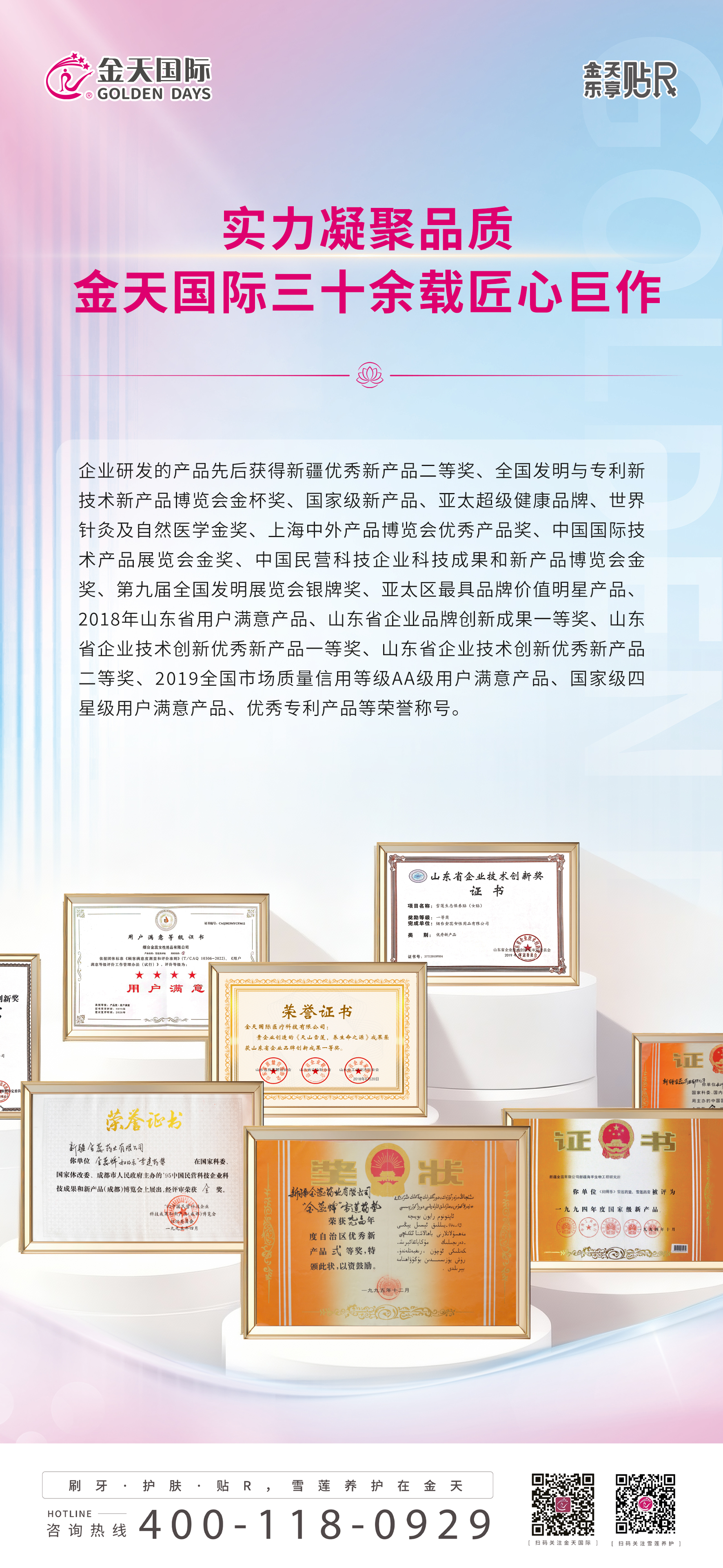 “国家级新产品”、“世界针灸及自然医学金奖”、“亚太超级健康品牌”……横跨国内外权威平台,金天国际产品以卓越品质赢得广泛信赖。这不仅是奖项的大满贯,更是科技与实力的完美印证!
