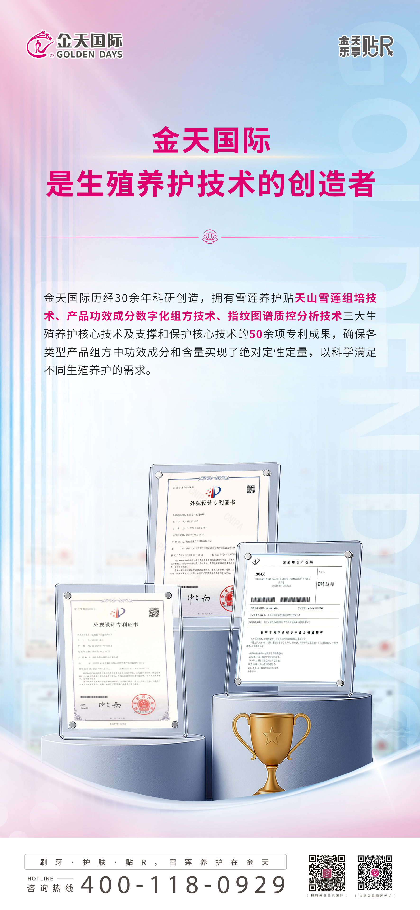 在生殖健康领域,有一个名字注定被铭记——金天国际。 它不是跟随者,而是从无到有的创造者。30余年潜心科研,开创“生殖养护”全新技术领域,让呵护从此有章可循。 三大核心技术,50余项专利加持,我们书写的,是行业的标准与开端。