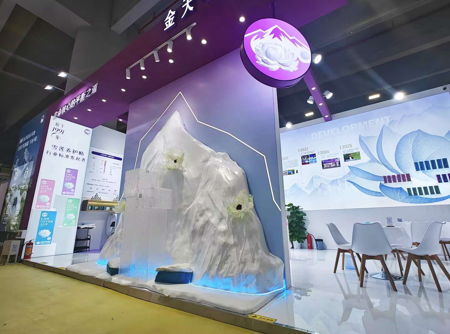 展位以天山雪莲“纯净、坚韧、修护”的自然意象为魂,将淡紫作为空间主色调设计。构筑出一方宛如雪域圣境的沉浸式体验空间。光影流转间,雪莲元素如精灵般点缀于每一处细节,柔和而治愈的紫色调,既暗合雪莲生长的雪域浪漫,又精准触达当代审美的心灵深处。行走其间,仿若置身天山之巅,感受雪莲破冰而出的坚韧与纯净。