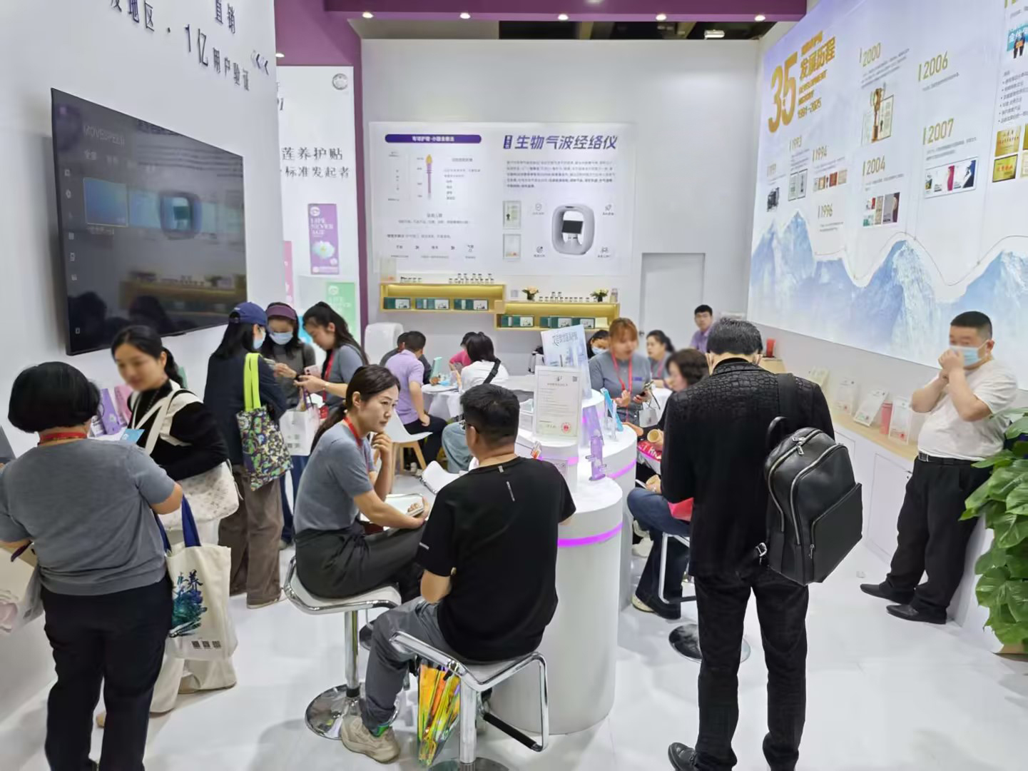 金天国际在展会现场,以恢弘阵列式展示雪莲养护贴从1991年到2025年长达三十五年的生殖养护行业编年史。 一幅波澜壮阔的行业发展画卷徐徐展开,见证金天国际从开创者到引领者的光辉历程。