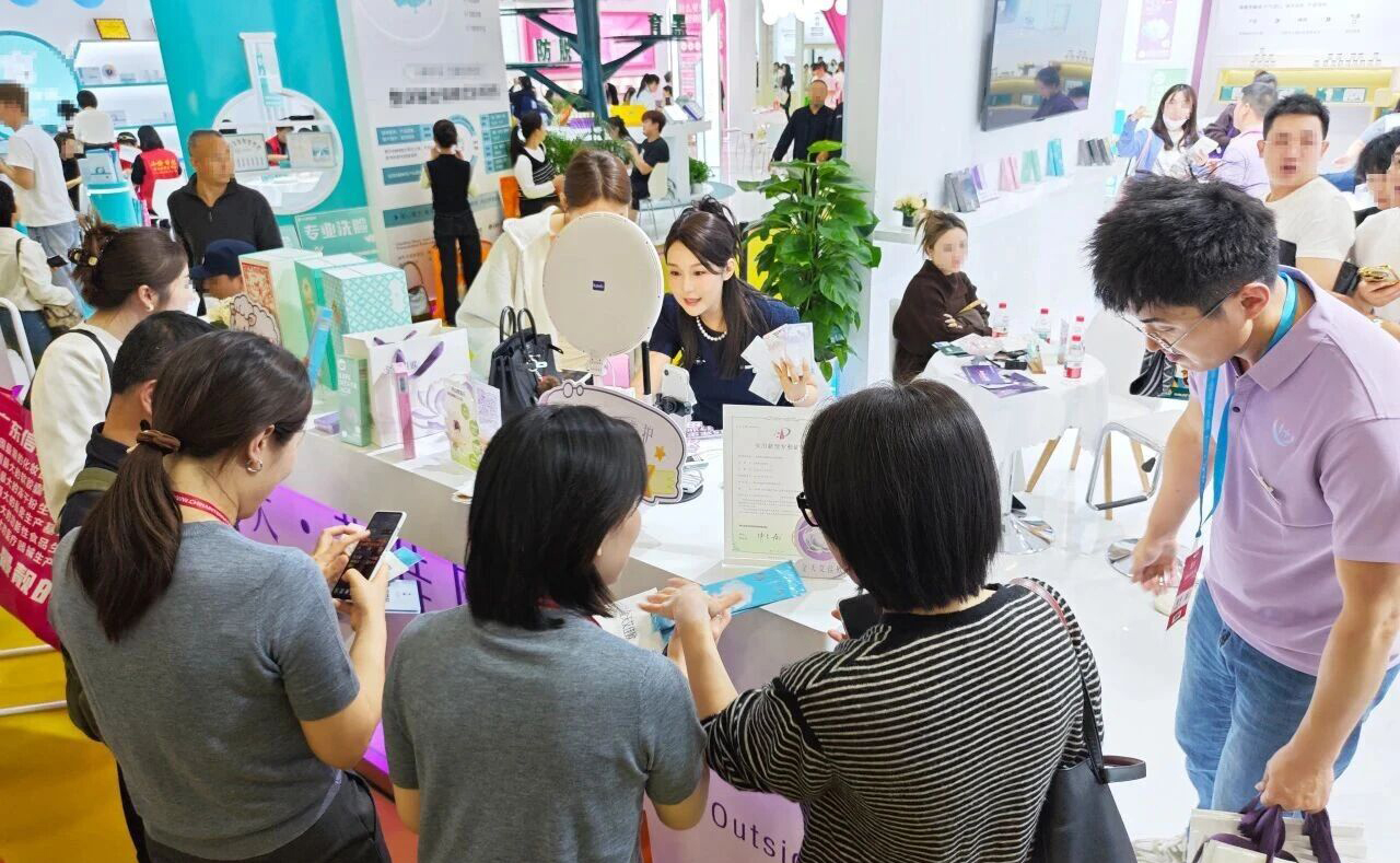 这不仅是一场视觉的盛宴,更是一场品牌精神的具象表达——金天国际以空间为媒介,传递对生殖健康的养护理念,让每一位参观者在步入展位的瞬间,便感知到金天国际雪莲养护贴的“纯净养护”。同风格色系的宣传物料与空间浑然一体,使得展位在万千展商中脱颖而出,光彩夺目,成为全场当之无愧的视觉地标。
